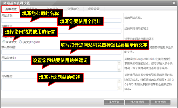 »ù±¾ÉèÖÃÖ÷ÒªÊÇÌîÐ´ÍøÕ¾Ãû³Æ¡¢Á¬½ÓµØÖ·¡¢ÍøÕ¾Ö÷ÓïÑÔ¡¢Ä¬ÈϵıêÌâ¡¢ÍøÕ¾¹Ø¼ü×Ö¡¢ÍøÕ¾ÃèÊö£¬ÌîдÍêºó¼ÇµÃµã»÷¡°±£´æ¸üС±¡£