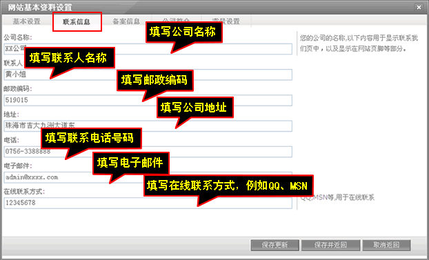 ÁªÏµÐÅÏ¢Ö÷ÒªÌîд¹«Ë¾Ãû³Æ¡¢ÁªÏµÈË¡¢ÓÊÕþ±àÂë¡¢µØÖ·¡¢µç»°¡¢µç×ÓÓʼþ¡¢ÔÚÏßÁªÏµ·½Ê½£¬ÌîдÍêºó¼ÇµÃµã»÷±£´æ¸üС£