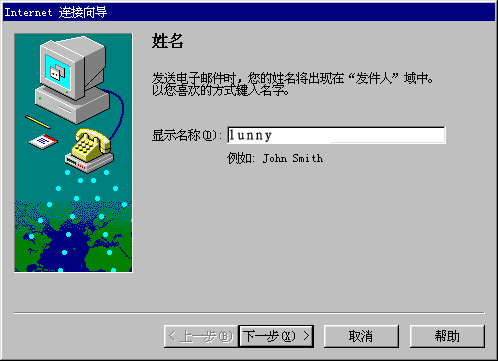 ¡¡¡¡´Ë´¦ÌîдµÄÊÇÔÚOutlook express ÖÐÄúµÄÓ¢ÎÄ»òÕ߯´ÒôÃû×Ö¡£Ëü²¢²»Ó°ÏìÄúµÄÈκι¤×÷£¬Ö»ÊÇÔÚÄúÓжà¸öÓÊÏäʱ¿ÉÒÔÓÃÀ´±êʶÊÇÄĸöÐÅÏä¡£ÖÁ´Ë£¬ÄúÒѾ¼òµ¥µÄÉèÖÃÍêÄúµÄÒ»¸öÐÅÏä¡£ÔÙ½øÐмòµ¥µÄ¼¸²½ÉèÖÃ,¾Í¿ÉÒÔ¿ªÊ¼Ê¹ÓÃÐÅÏäÁË¡£